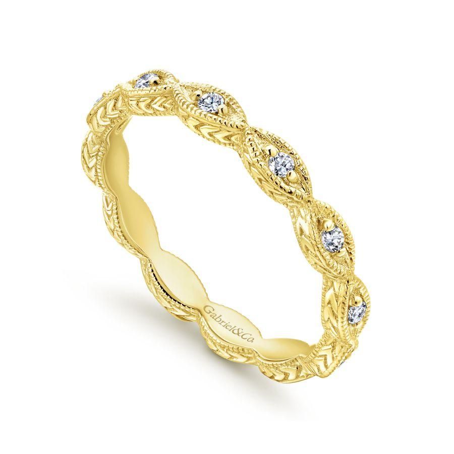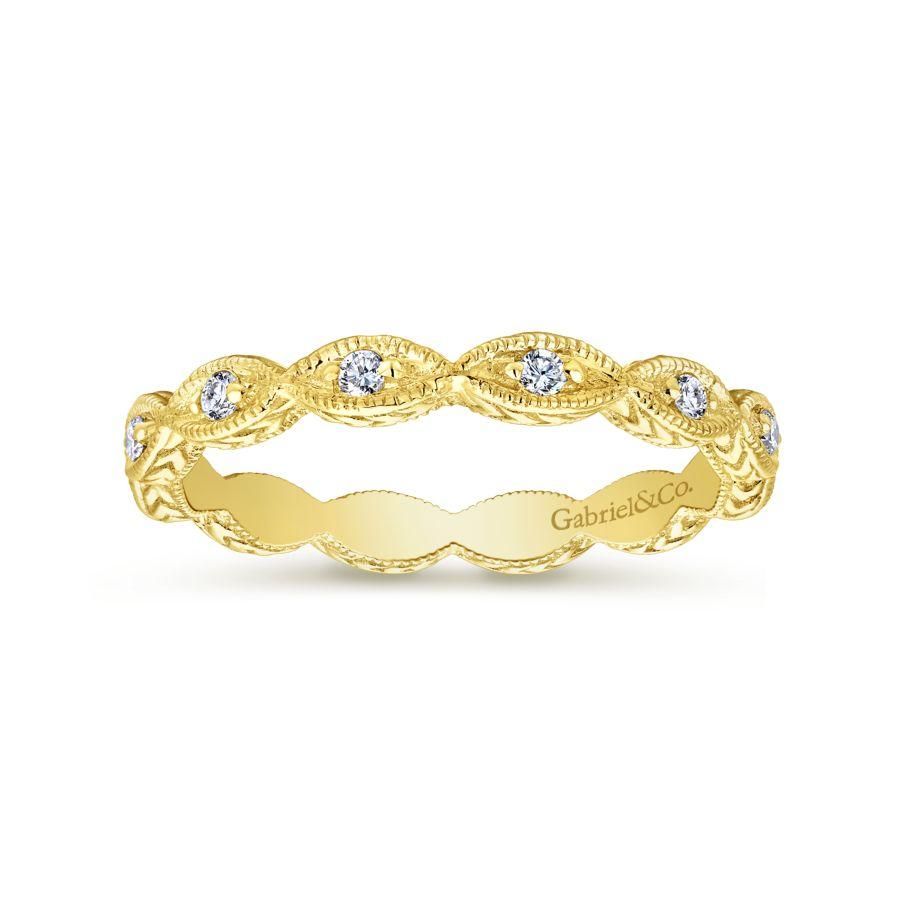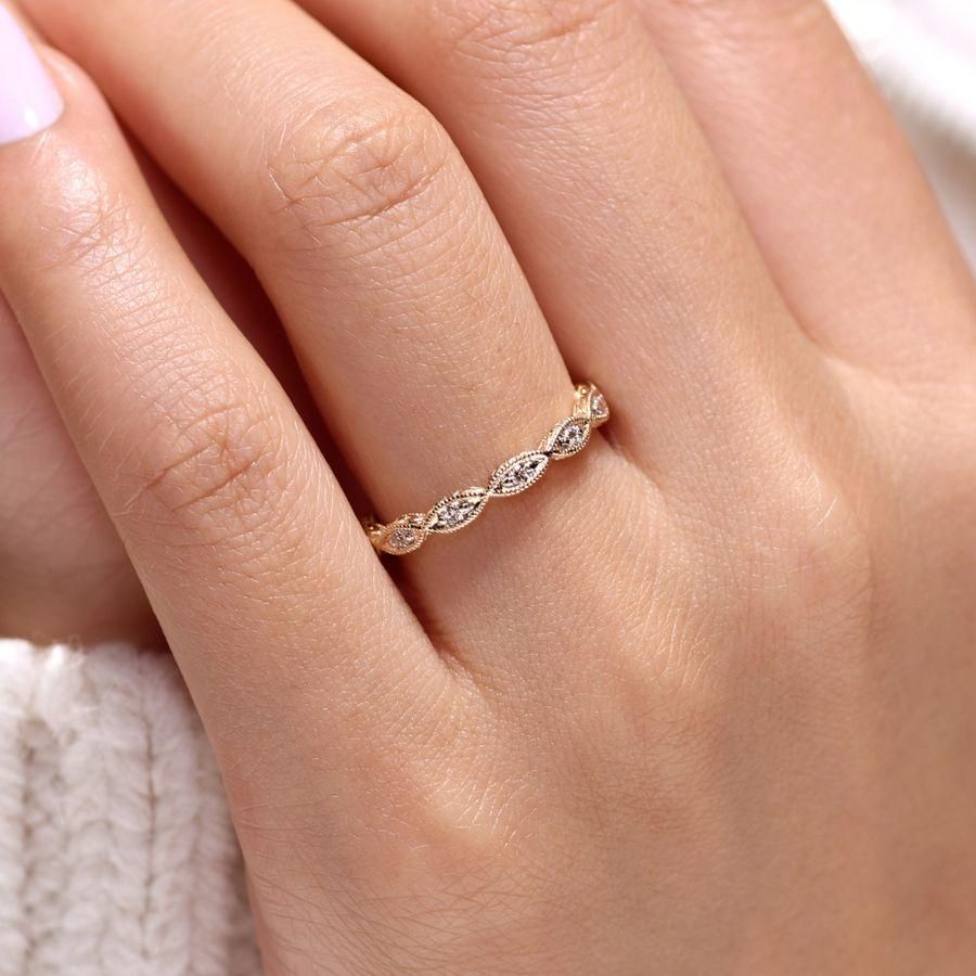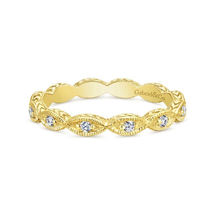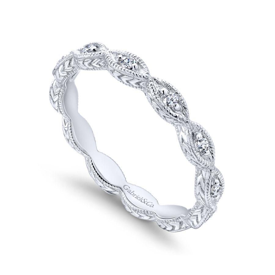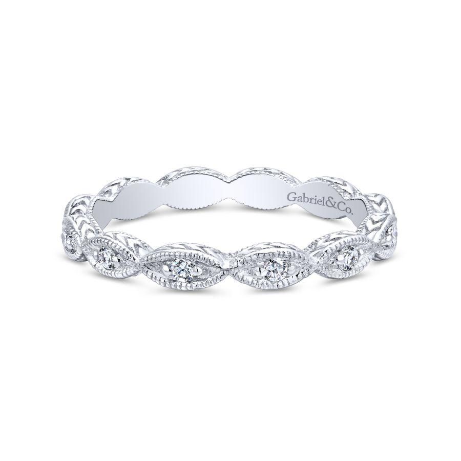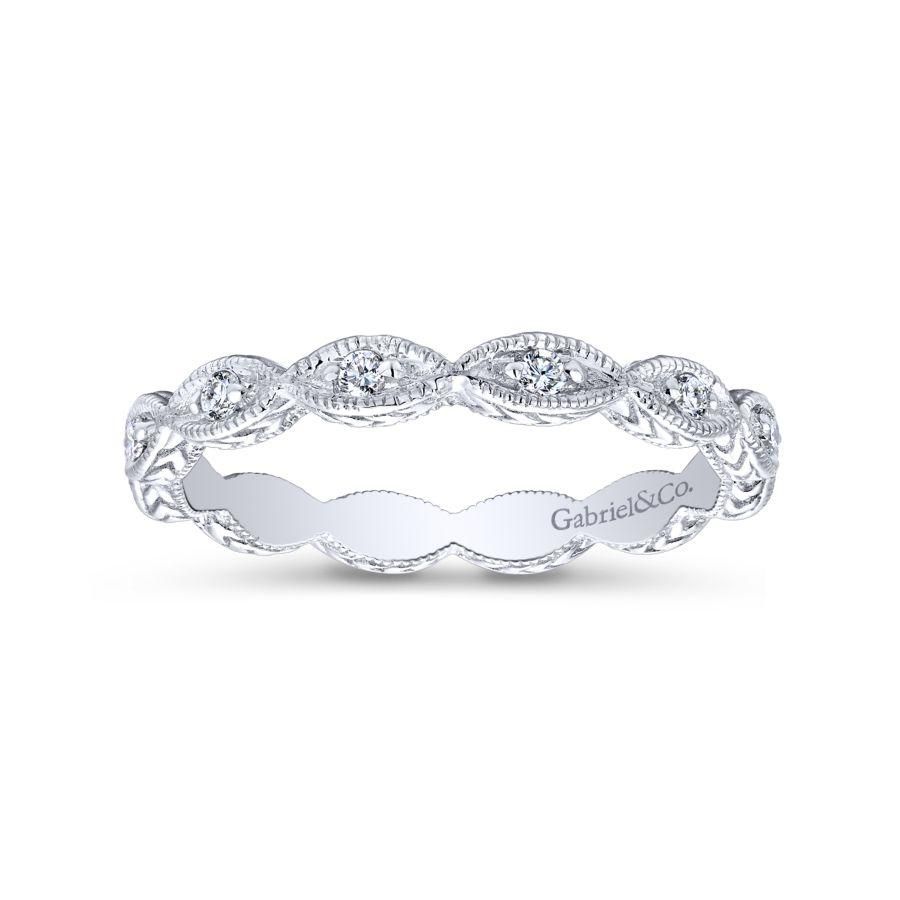 Luminous 14K white gold ring designed for stacking featuring brilliant 0.10ct diamonds. Marquise shapes create a scalloped silhouette, elevated with milgrain borders and engraving along the profile of the stackable band.