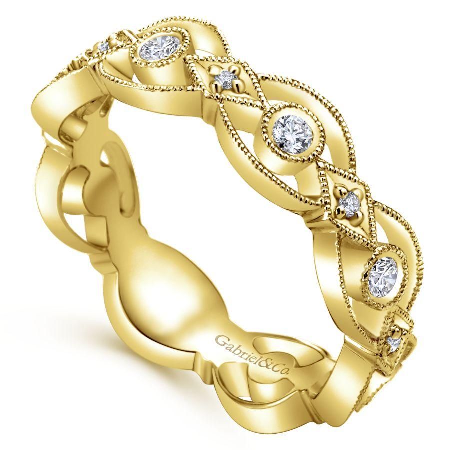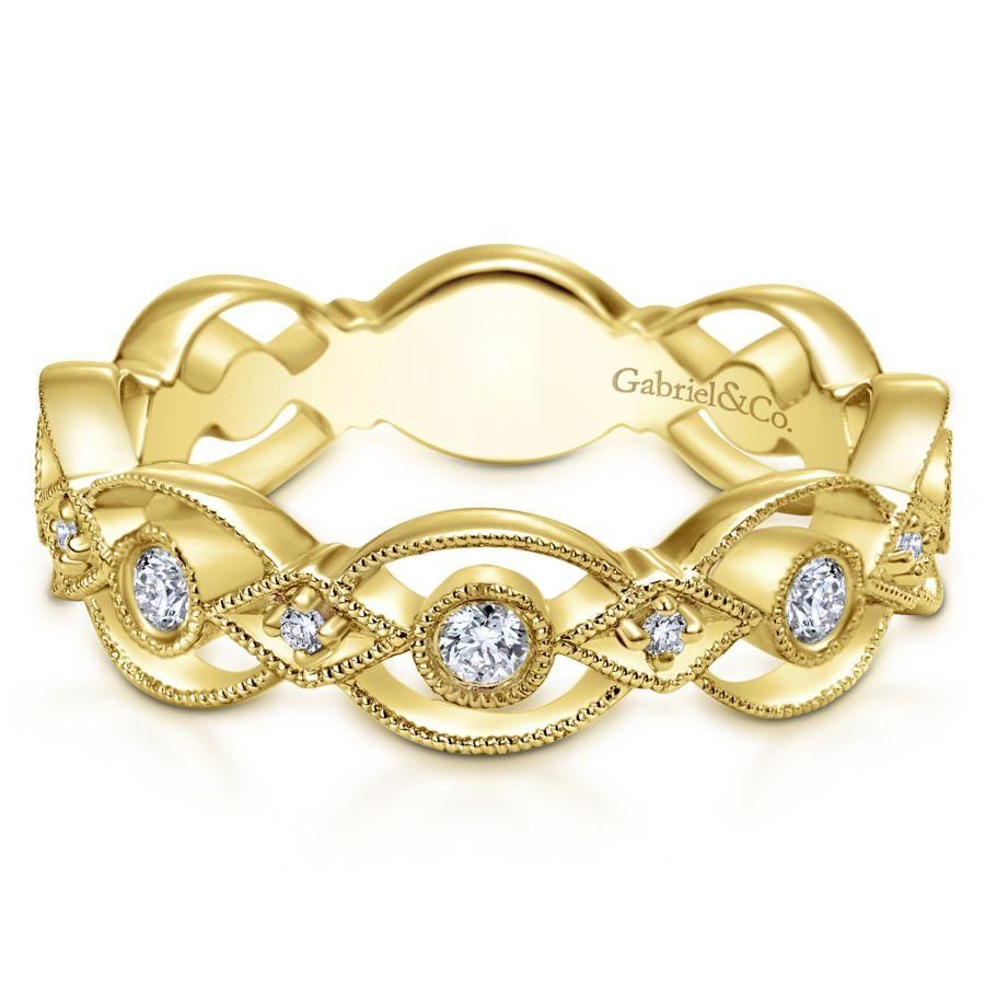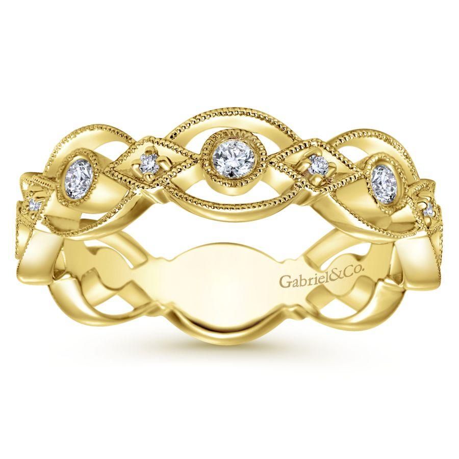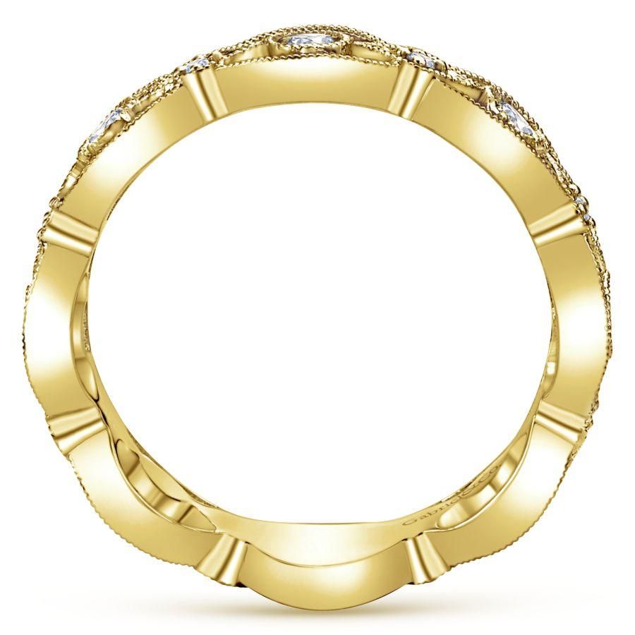 Intricate scrollwork and precisely placed diamonds come together to create this royal yellow gold stackable ring.
