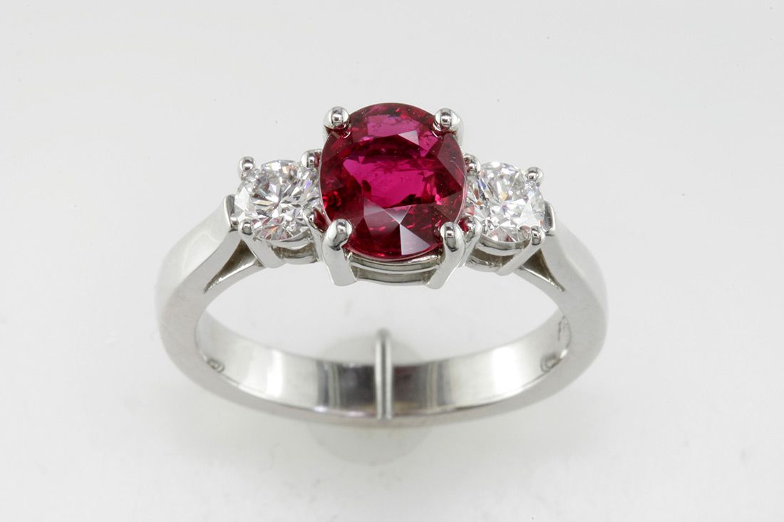 18K White Gold 3-Stone Oval Ruby and Round Diamond Ring