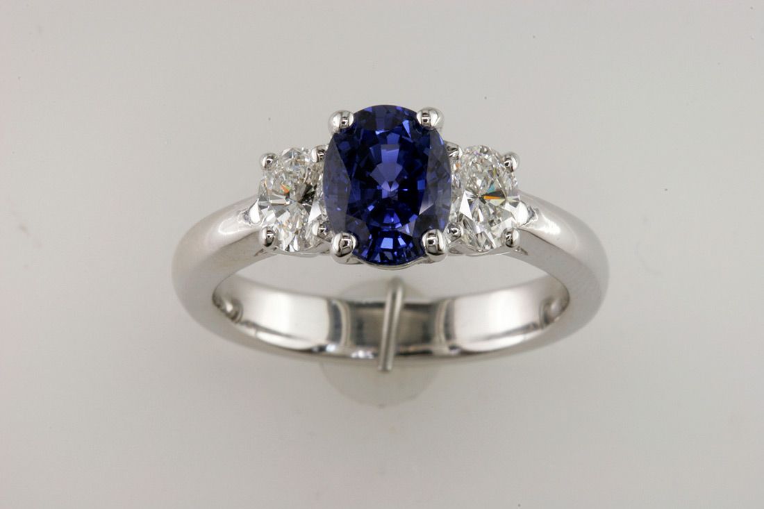 18K White Gold 3-Stone Oval Sapphire and Round Diamond Ring