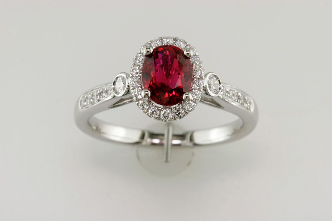 18K White Gold 3-Stone Oval Ruby and Round Diamond Ring