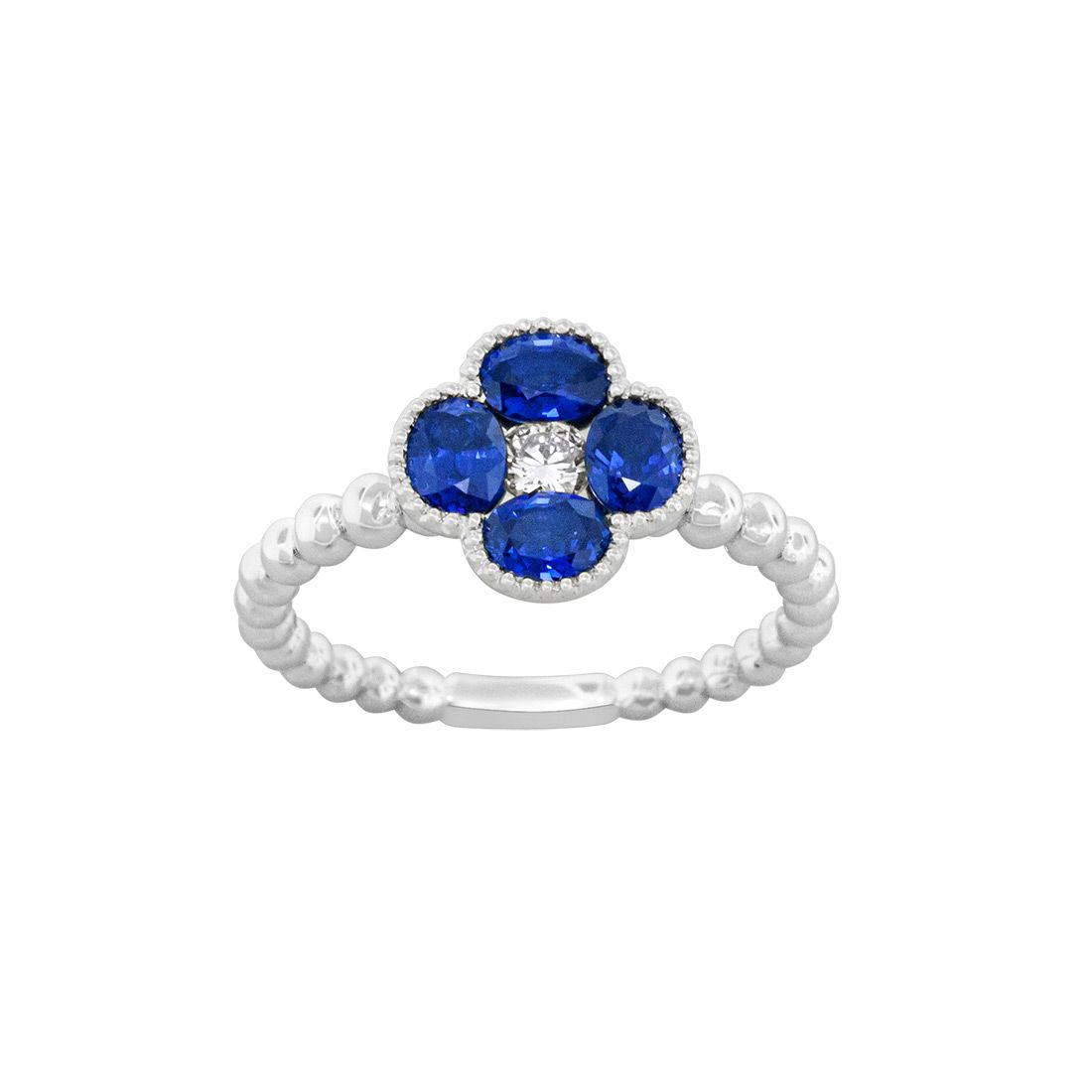 18K White Gold Oval Sapphire and Round Diamond Cluster on a Polished Bead Band