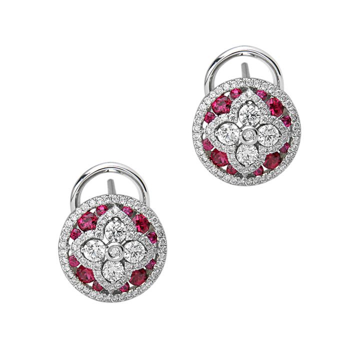 18K White Gold Round Ruby and Diamond Omega Back Button Earrings