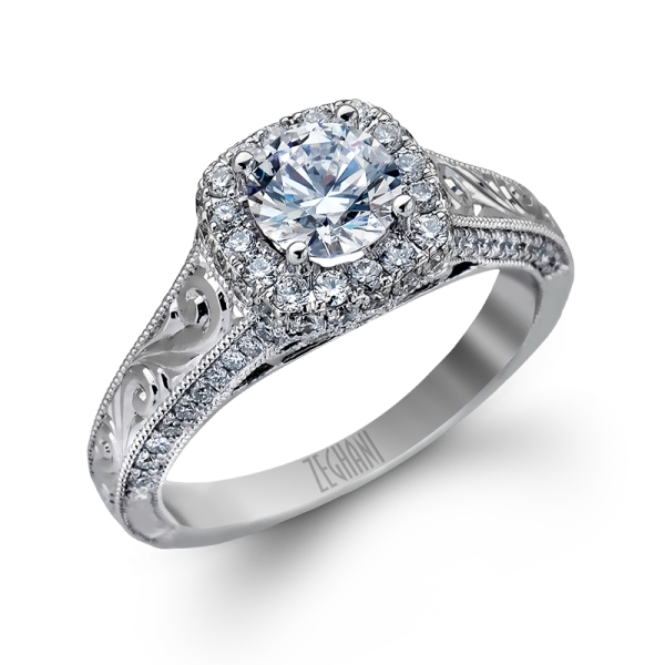 This 14K white gold engagement ring sparkles brightly with hand engraved embellishments.