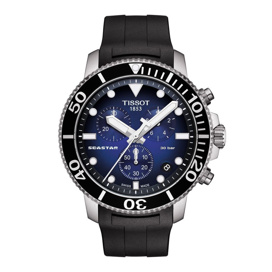 Stainless Steel "SeaStar" Tissot 1000 Chronograph Watch with a Black Dial