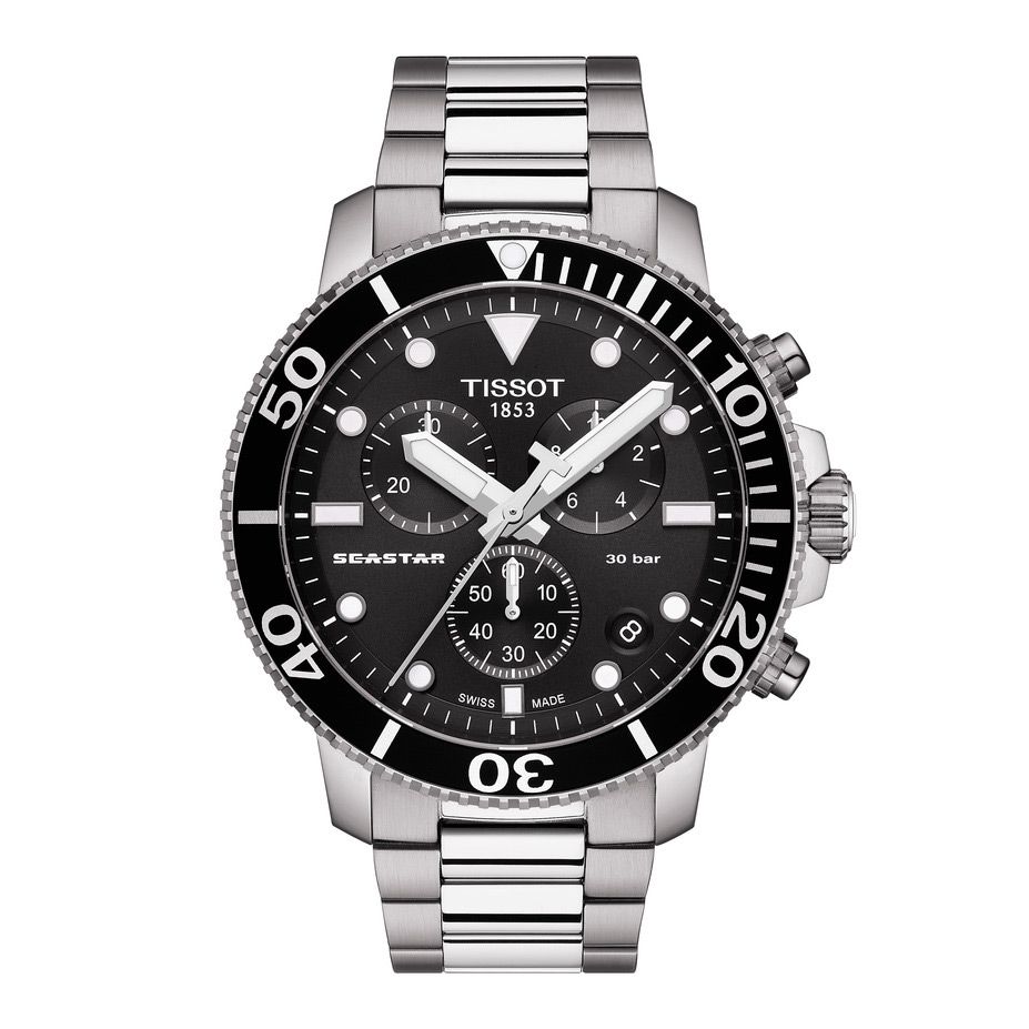 Stainless Steel "SeaStar" Tissot 1000 Chronograph Watch with a Black Dial
