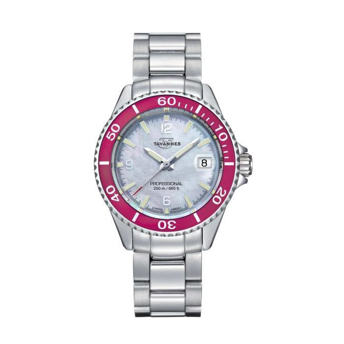 Stainless Steel Tavannes "Ocean Edge" Dive Watch with a Pink Bezel, Mother of Pearl Dial, Sapphire Crystal, and water resistant up to 660 feet